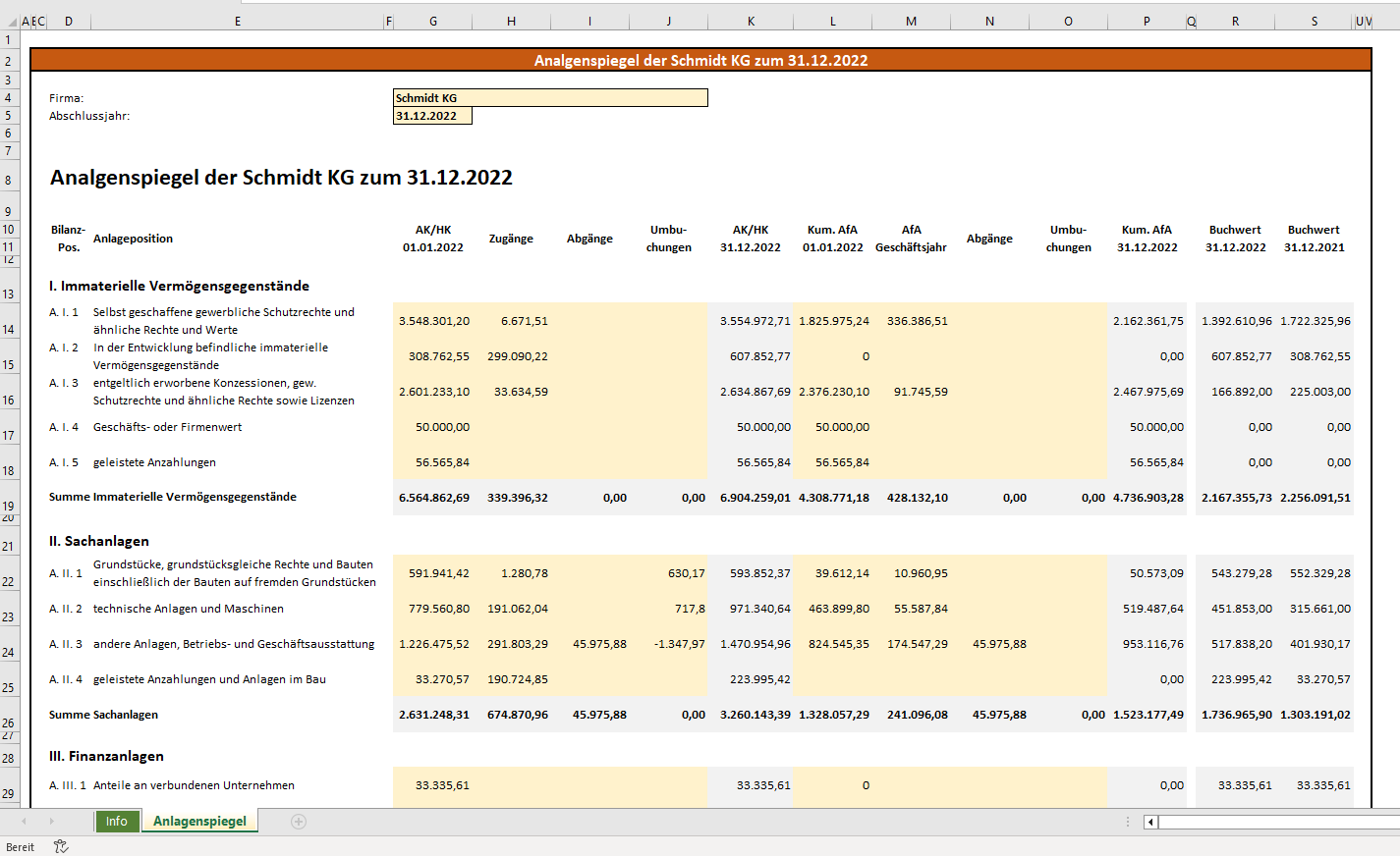 Geben Sie im Tabellenblatt „Eingaben“ alle Daten zu Ihren verschiedenen Anlageklassen ein. Dazu gehören die historischen Anschaffungskosten, die Zugänge, die Abgänge des Geschäftsjahres, die Umbuchungen, die Zuschreibungen, die Gesamtabschreibung, die Abschreibung des Geschäftsjahres und die kumulierte Abschreibung der verkauften Anlagen.