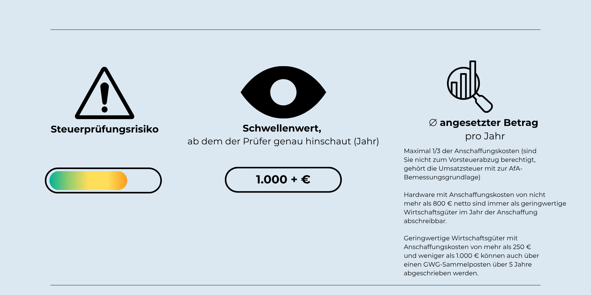 Voraussetzung ist, dass die Hardware zu mehr als 10 % betrieblich genutzt wird. Ist dies nicht der Fall, gehört die Hardware zu deinem Privatvermögen und wirkt sich nicht steuerlich aus.