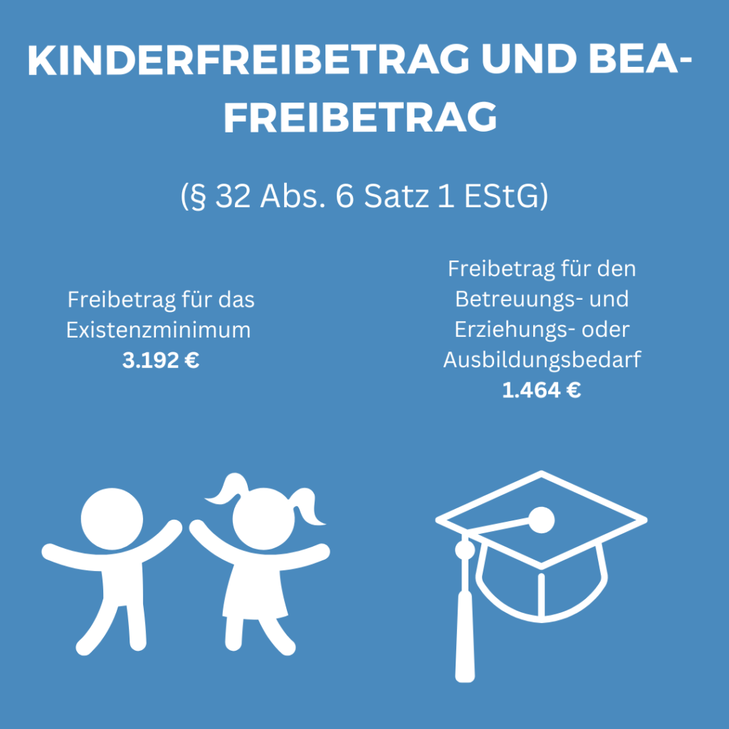 Für jedes zu berücksichtigende Kind gewährt der Fiskus einen Freibetrag in Höhe von 3.192 € für das Existenzminimum (Kinderfreibetrag) und in Höhe von 1.464 € für den Betreuungs- und Erziehungs- oder Ausbildungsbedarf (§ 32 Abs. 6 Satz 1 EStG).