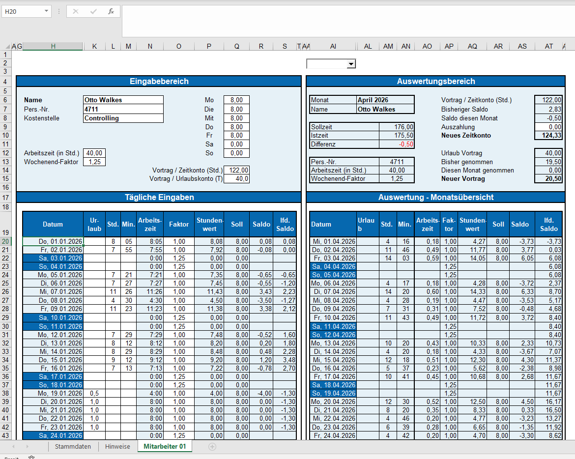 Mit dem Excel-Rechner "Zeiterfassung" kannst du die Arbeitszeit, das Freizeitkonto und den Urlaub deiner Mitarbeiter verwalten.