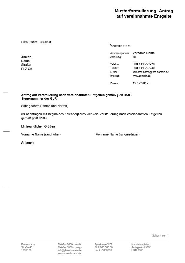 Hier reicht ein kurzes Schreiben an das Finanzamt: Antrag auf vereinnahmte Entgelte