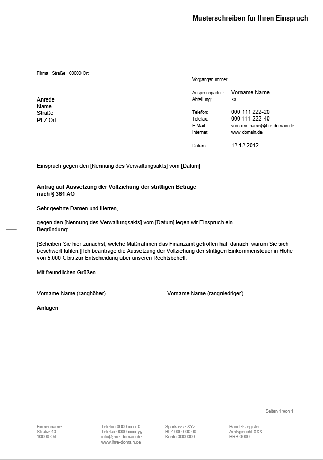 Gerade wenn Sie sich gegen einen Steuerbescheid wenden, bei dem sich Ihr Einspruch gegen eine Steuernachzahlung richtet, sollten Sie in Ihr Einspruchsschreiben einen Antrag auf Aussetzung der Vollziehung aufnehmen. Dieser Antrag bewirkt, dass Ihr Finanzamt den strittigen Betrag bis zu Entscheidung über den Einspruch so behandelt, als wäre er nicht vorhanden. Über Ihren Aussetzungsantrag entscheidet Ihr Finanzamt unmittelbar nach Eingang des Antrags. Für eine Aussetzung ist es aber erforderlich, dass Ihr Einspruch mit einer Begründung versehen ist. Fehlt die Begründung, kommt es nicht zu einer Aussetzung, bis Sie die Begründung nachgereicht haben. Über die Aussetzung erhalten Sie einen entsprechenden Bescheid.