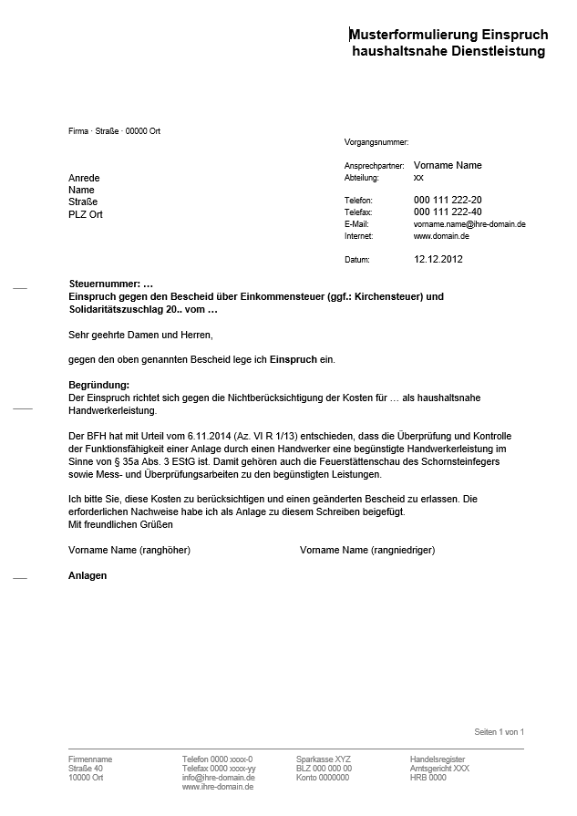 Mit diesem Muster legen Sie Einspruch für haushaltsnahe Dienstleistungen ein