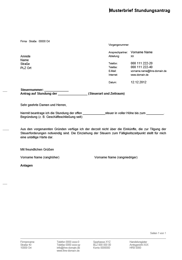 Das Muster "Stundungsantrag" bietet Ihnen Unterstützung bei der Formulierung Ihres Stundungsantrags. Ergänzen Sie das Muster mit einer kurzen Begründung, um es zu versvollständigen.