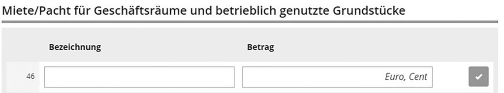 Trage in dieser Zeile die Mietkosten für dein Büro und andere Räume ein, die du für deinen Betrieb nutzt oder für deine Praxis angemietet hast. In diese Zeile gehören allerdings nur die Kosten für Räume, die außerhalb deiner Wohnung liegen.